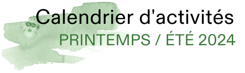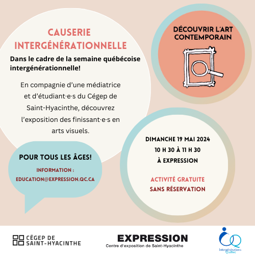 - 19 mai 2024 : Causerie intergénérationnelle dans le cadre de la semaine québécoise intergénérationnelle, de 10 h 30 à 11 h 30. Gratuit, aucune réservation requise.