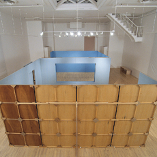 For over thirty years, the Montreal painter Christian Kiopini has been preoccupied with the formal and referential modalities of pictorial space. He combines geometric and organic forms with gestural marks and tonal variations, while simultaneously using perspectival effects to undermine the flatness of surfaces. The installation Projet S, deuxième version (2002-2003), being shown at EXPRESSION by Christian Kiopini for the first time, explores both pictorial issues and spatial mechanisms, thus establishing a continuity with his previous practice. Projet S, deuxième version consists of two large painted structures reminiscent of theatrical stage sets. Spectators are encouraged to step inside them, to walk around them, and to experience the realities and illusions generated by the ensemble.
