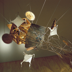 The practice of artist François Mathieu, who has been working in the Quebec City region for some fifteen years, is primarily sculptural. He frequently combines his preferred material – wood – with other materials and objects, producing hybrid constructions whose iconography and discourse evoke the religious realm. The artist's aim is to adapt the functions and effects of religion to an era marked by scepticism and neglect of the ecclesiastical heritage. François Mathieu is presenting a selection of works at EXPRESSION. One, Les Vagues porteuses (2001), which in form resembles a church spire, recalls the machines designed by Leonardo da Vinci. Suspended from the ceiling, the ten-metre-long piece seems to float in the exhibition space.