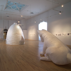 Catherine Sylvain is a young Montreal artist already making a name for herself with a practice that combines sculpture and performance. The colour white, articles of clothing and unexpected shifts of scale feature regularly in her works, which are the product of an ongoing meditation on the modern individual's relations with self, the environment and the rest of humanity. Identity, interpersonal relations and emotional substitution are the artist's favoured themes. In 2003, for instance, having observed that people take walks more often with their dog than with their spouse, she created Femme-chien, a large blow-up sculpture of a dog that accompanied her in public. The exhibition being presented by Catherine Sylvain at EXPRESSION consists of a piece executed especially for the occasion, together with a selection of sculptures, photographic works and images documenting her performances.